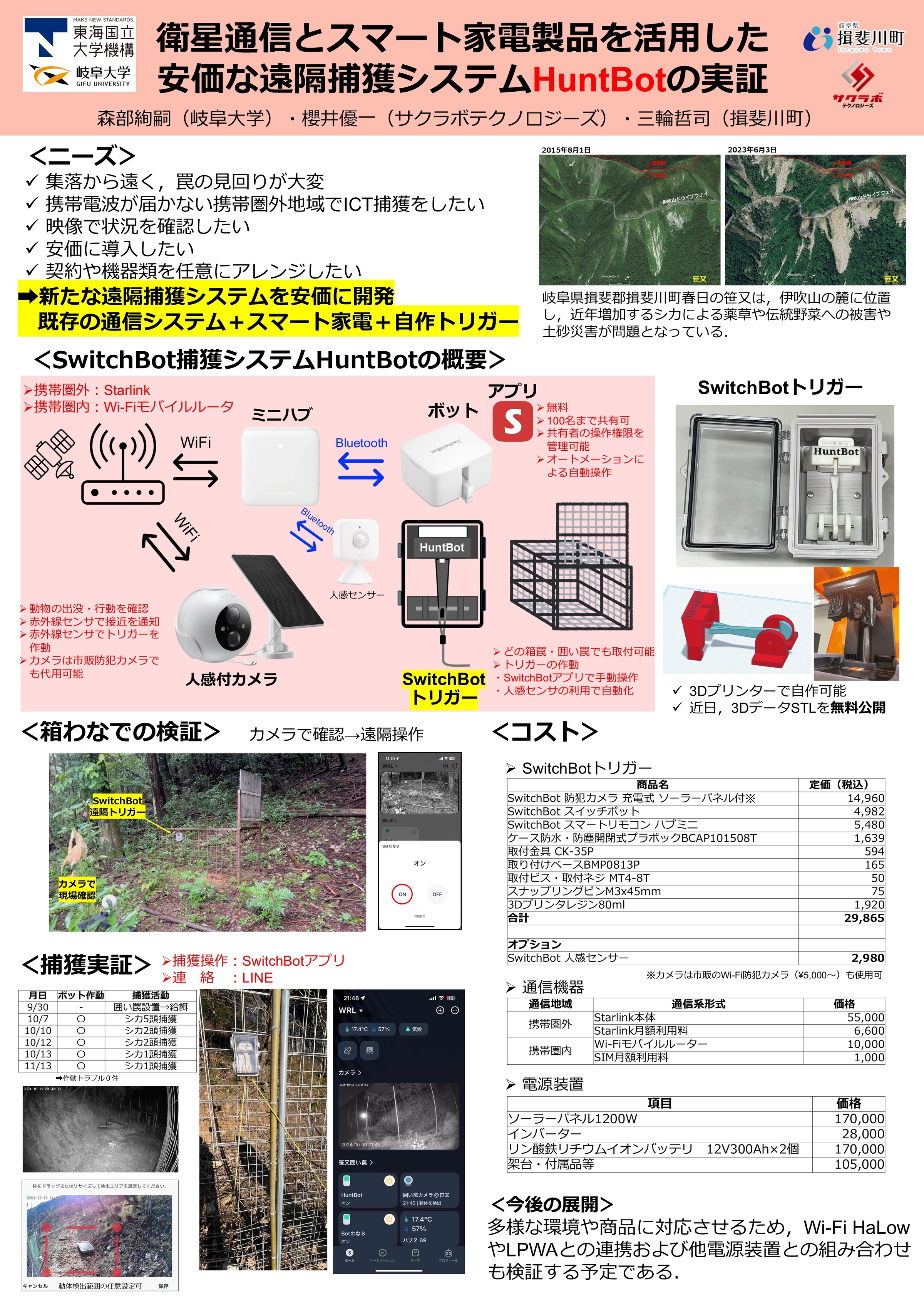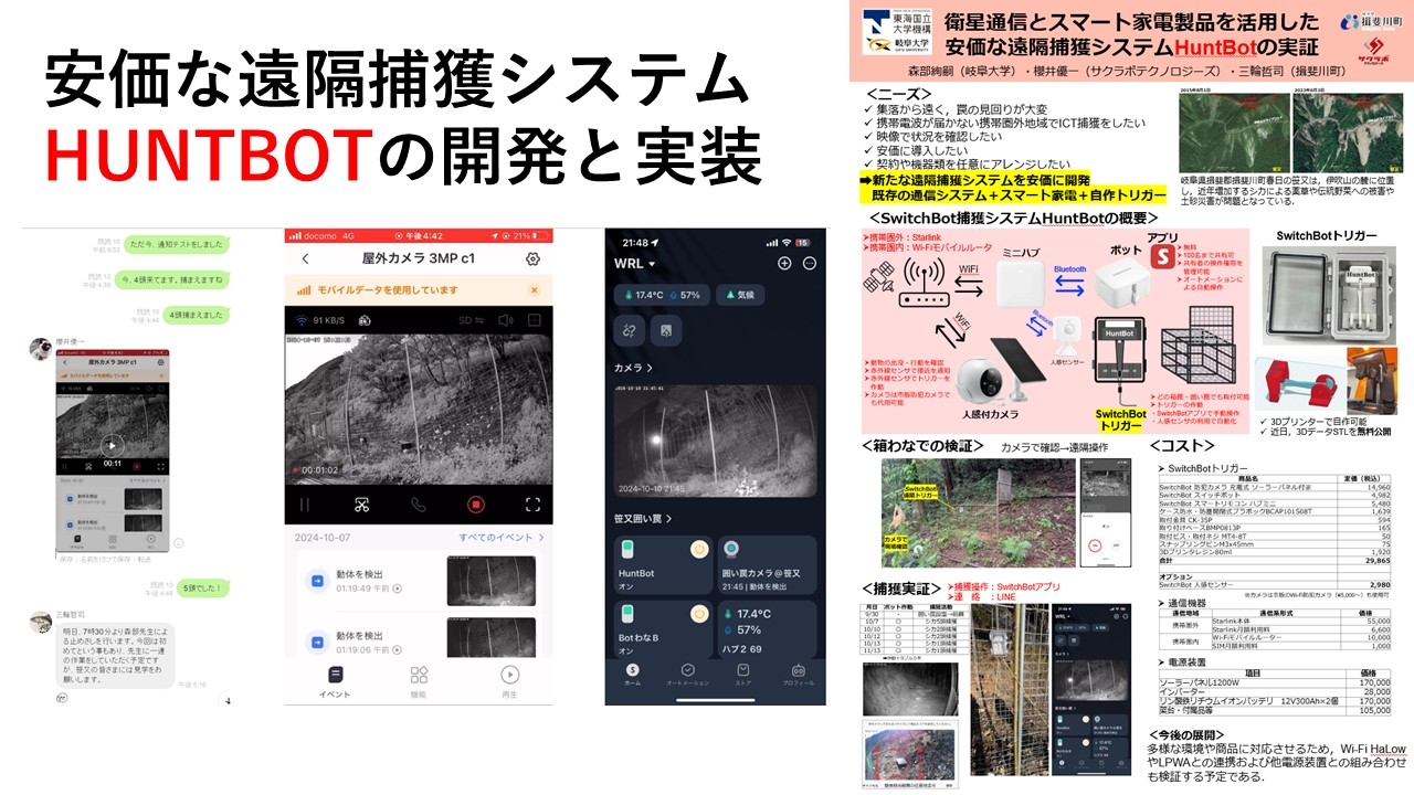 森部絢嗣, 櫻井優一, 三輪哲司.衛星通信とスマート家電製品を活用した安価な遠隔捕獲システムHuntBot の実証.第10回山岳科学学術集会&第29回「野生生物と社会」学会 合同大会 2024年12月14日.