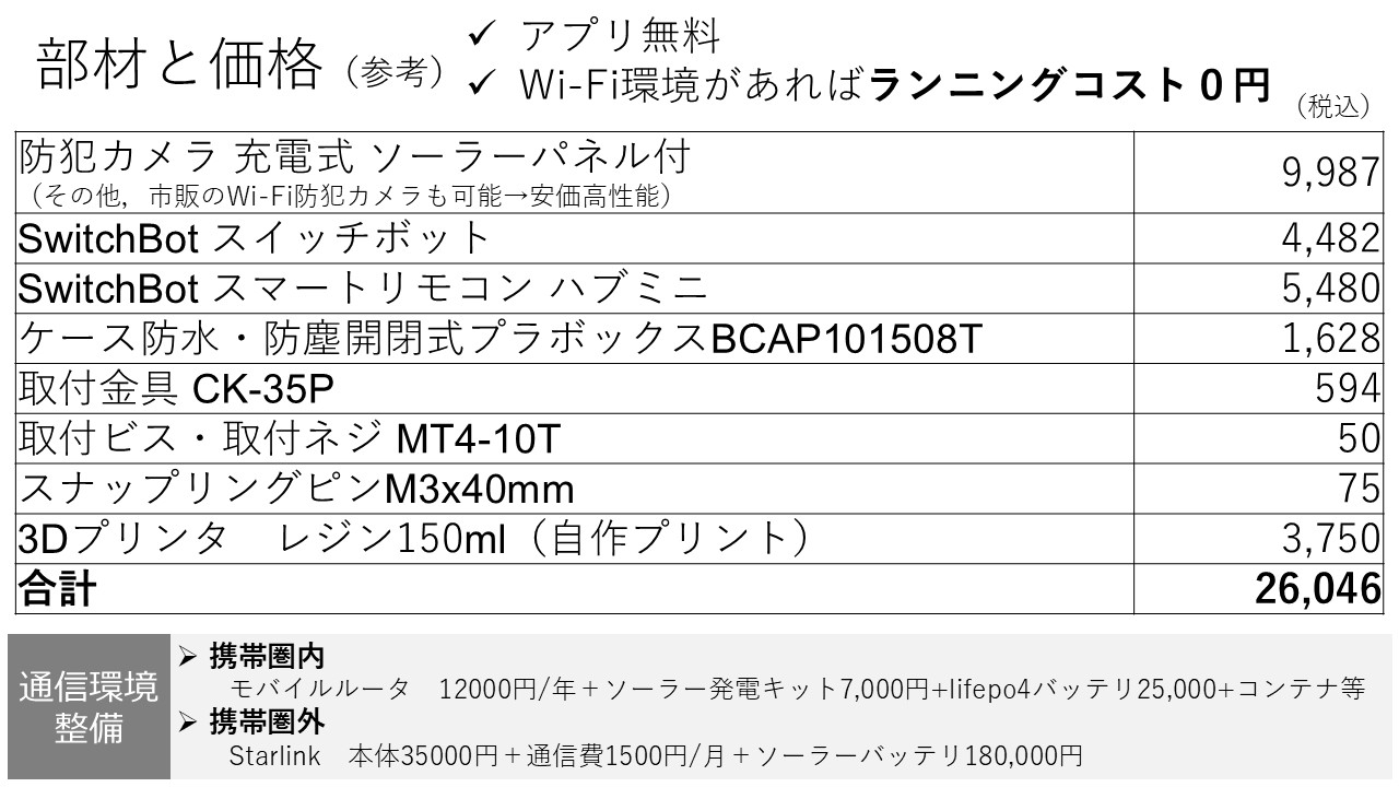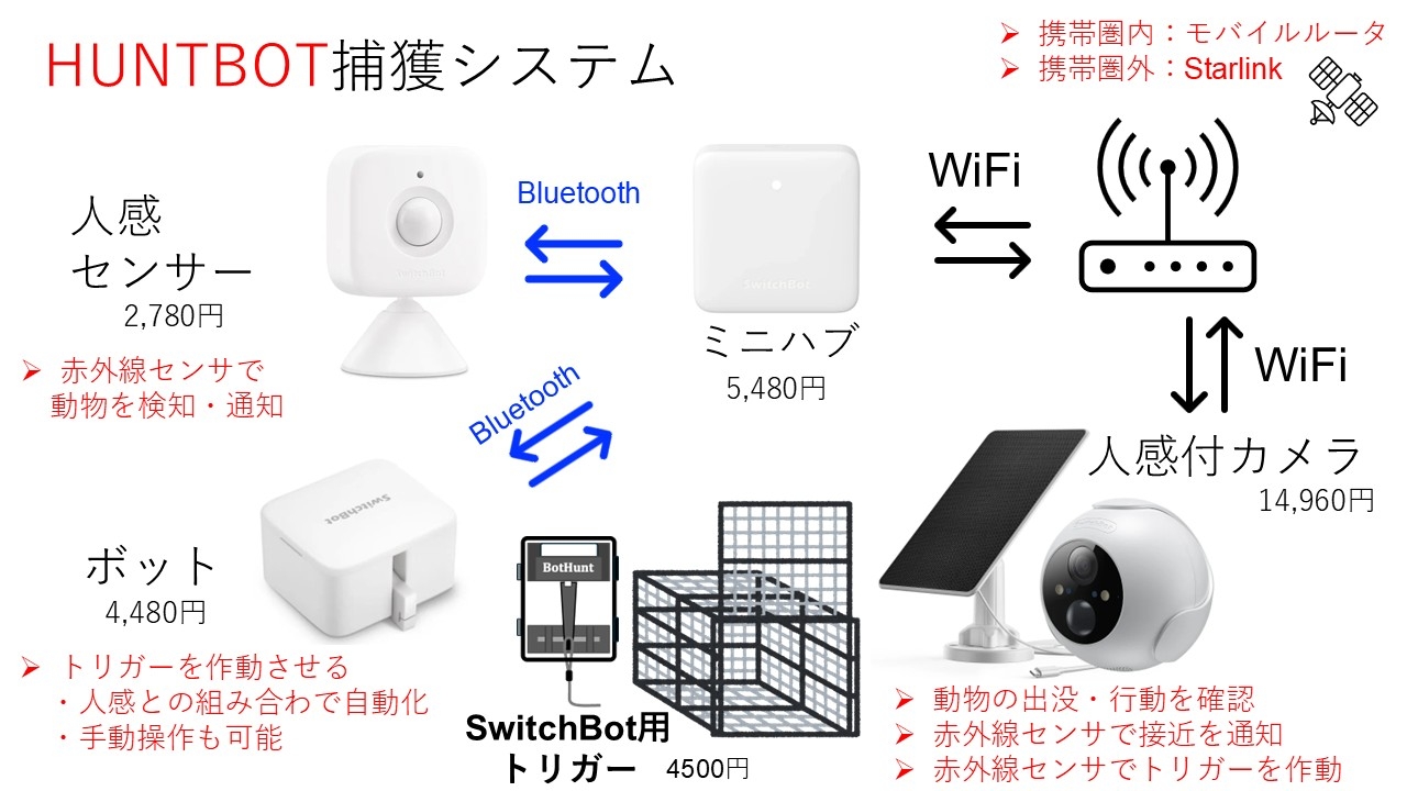 捕獲現場にWi-Fi環境を構築し,防犯カメラで動物の罠への侵入状況を確認しながら,スマート家電システムSwitchBotを組み込んだHUNTBOT(トリガーシステム)を,SwitchBotアプリ上で操作することで,囲い罠または箱罠の扉を遠隔で閉じる仕組みです。