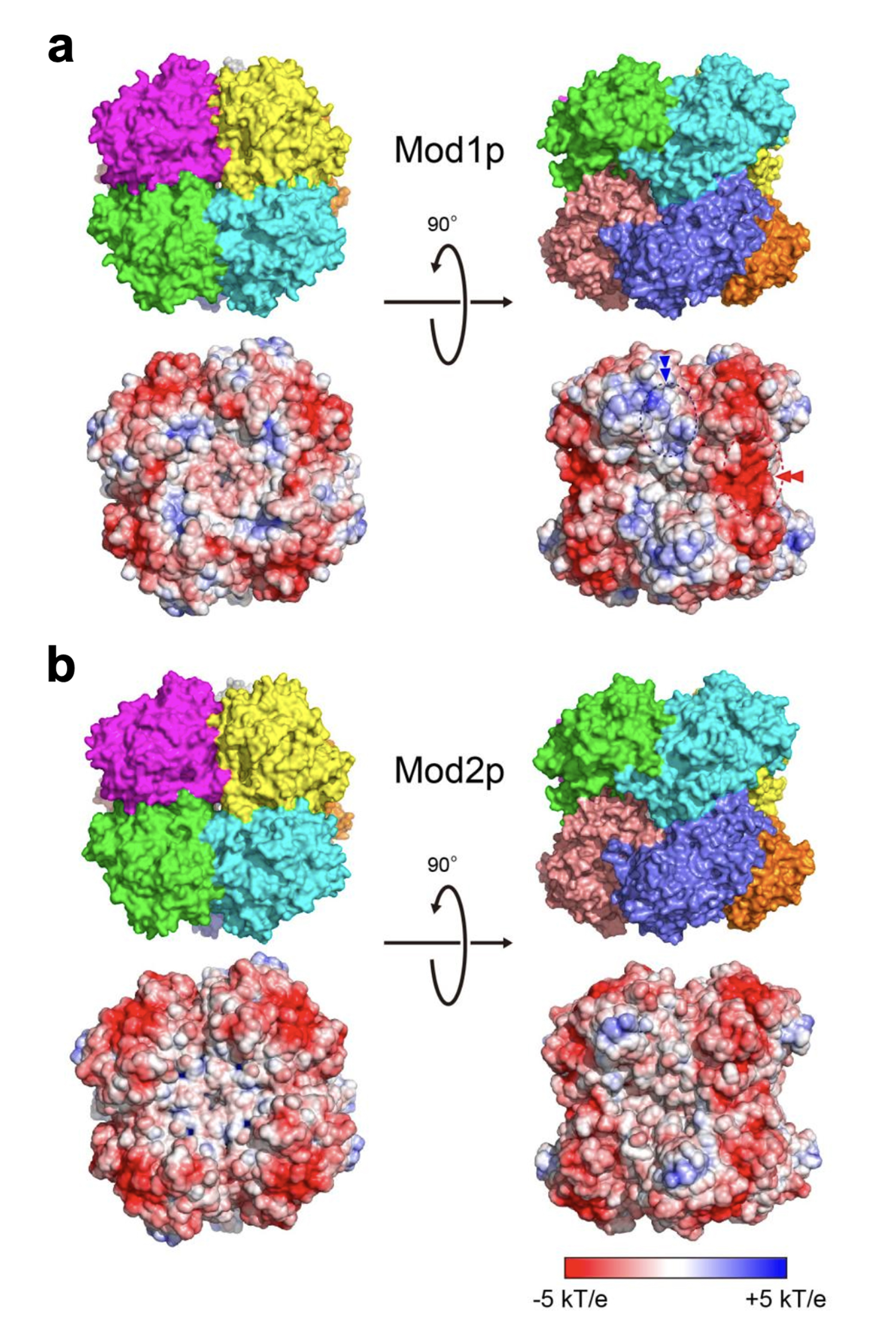FIGURE 1 | The octameric structures and surface charge distributions of Ogataea methanolica (a) Mod1p and (b) Mod2p. Each monomer is shown in a different colour.